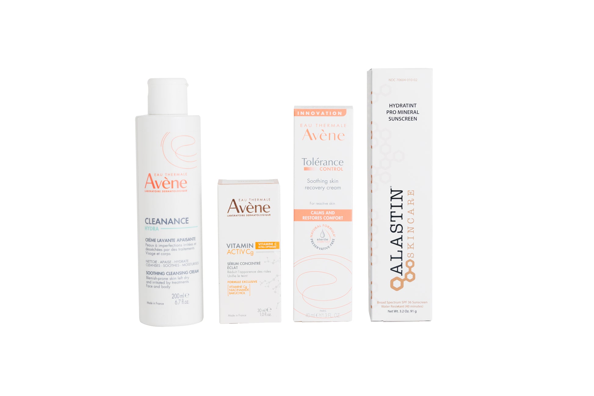 Includes Clenance Hydra Cleansing Cream, Vitamin C, Clenance Hydra Soothing Cream, Alastin Hydratant Promineral Sunscreen.